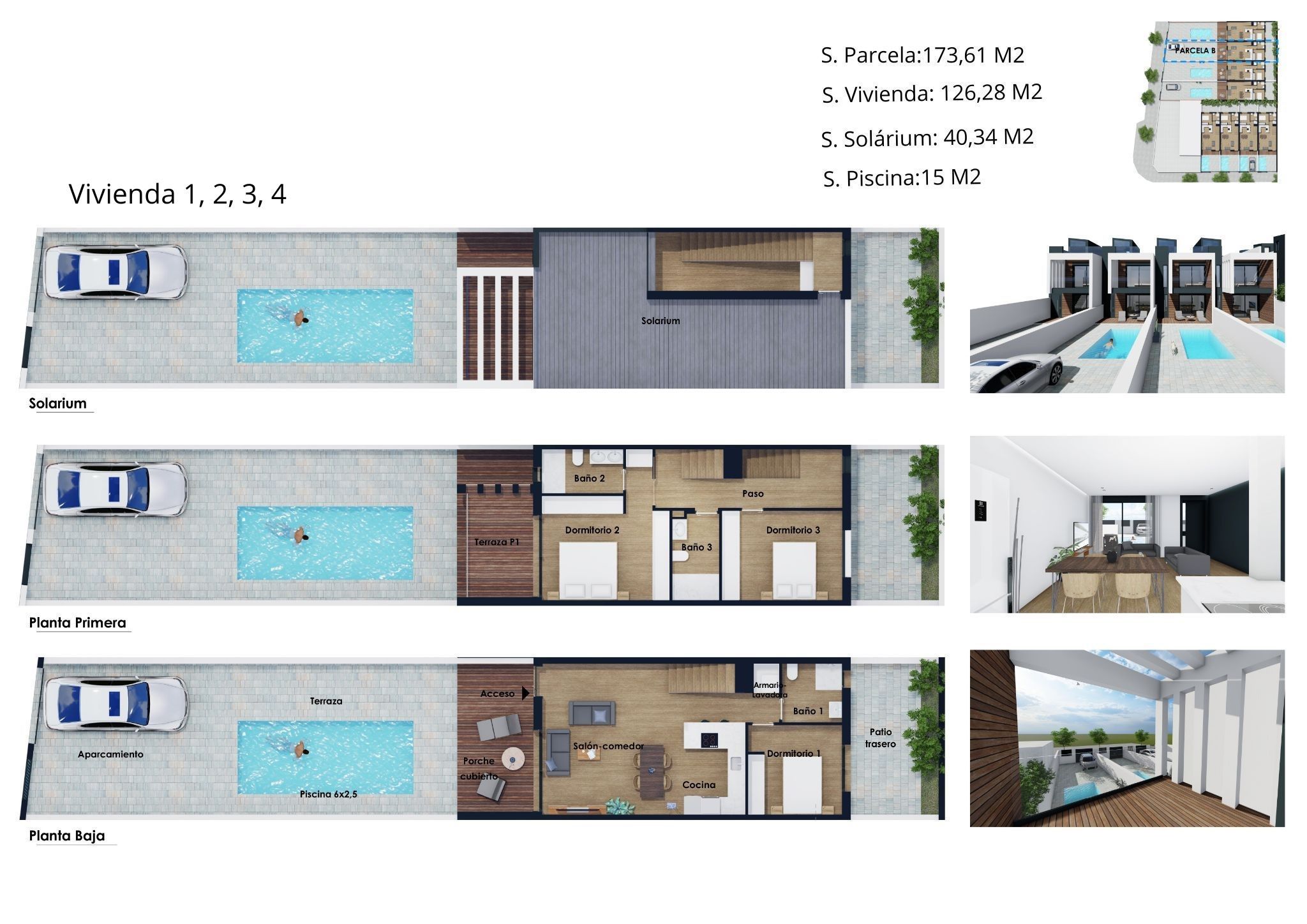 Exteriéry těchto řadových domů jsou navrženy tak, aby maximalizovaly požitek ze středomořského klimatu. Každá nemovitost má soukromou zahradu, ideální pro venkovní relaxaci. Navíc prostorné terasy umožňují venkovní stolování nebo jen relaxaci na slunci. Pro ty, kteří hledají další prostor, je solárium ideální volbou, poskytující soukromé místo pro opalování nebo vychutnání si výhledu. Zahrnutí privátního bazénu v každém domě přidává nádech luxusu, což umožňuje osvěžení v horkých dnech bez opuštění domova.