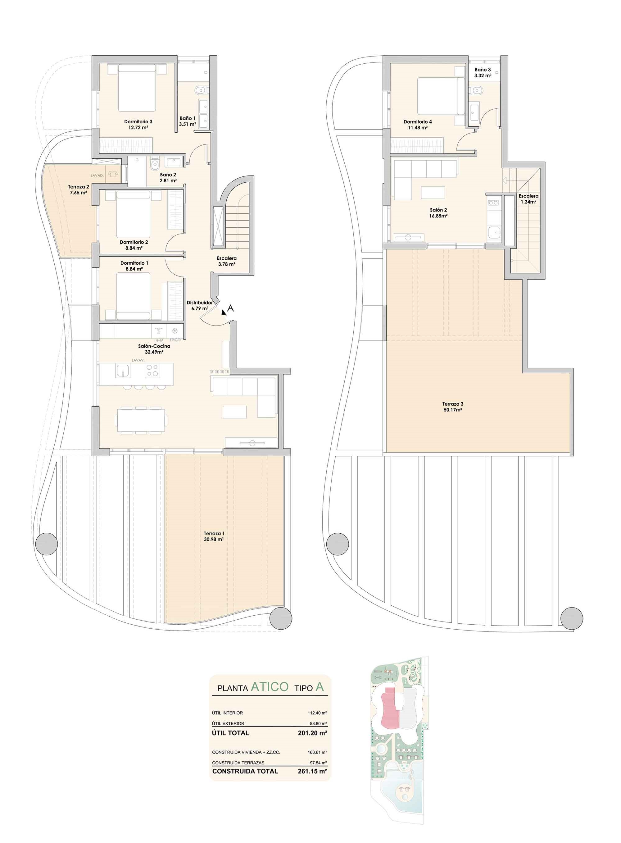 Interiéry nemovitostí jsou navrženy tak, aby poskytovaly maximální komfort a funkčnost. Každý apartmán a penthouse je vybaven moderními spotřebiči a elektrickými žaluziemi, které usnadňují každodenní život obyvatel. Vestavěné skříně poskytují dostatek úložného prostoru a udržují prostory uklizené a bez nepořádku. Dispozice nemovitostí, s možnostmi 3 nebo 4 ložnic a 2 nebo 3 koupelen, umožňuje přizpůsobení podle potřeb každé rodiny. Vysoce kvalitní povrchové úpravy, jako je porcelánová dlažba na podlahách, dodávají každé místnosti nádech sofistikovanosti a elegance, čímž vytvářejí útulnou a moderní atmosféru.