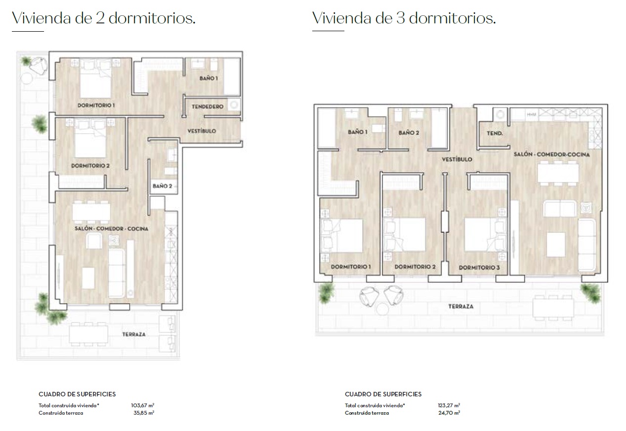 Nemovitosti, které zahrnují apartmány a přízemní byty, jsou vybaveny moderními prvky, které zajišťují maximální komfort. Interiéry mají vestavěné skříně, které poskytují dostatek úložného prostoru. Předinstalace klimatizace zajišťuje příjemné prostředí po celý rok. Každý byt je navíc vybaven videotelefonem, který nabízí bezpečnost a pohodlí. Dispozice zahrnuje možnosti se dvěma nebo třemi ložnicemi a dvěma koupelnami, které se přizpůsobí různým rodinným potřebám. Zahrnutí garáže přidává obyvatelům další úroveň pohodlí.