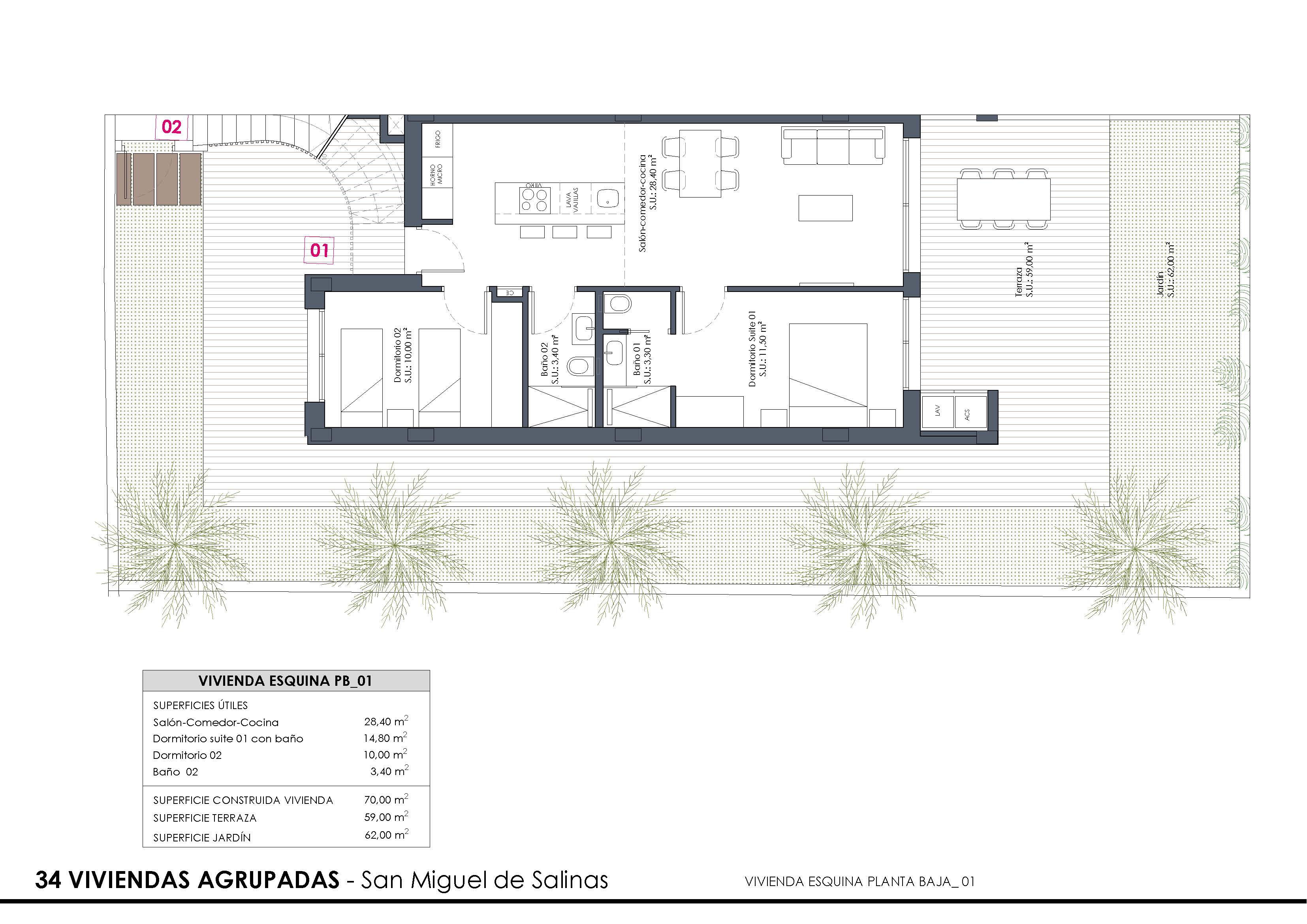 Low-bungalow på 70 m² – enhed 01 – i La Cañada, San Miguel de Salinas, præsenterer sig som et behageligt hjem på stueplan med nem adgang og en rolig, grøn ramme. Under ref. 10851943-01 får du en moderne base, hvor funktion og komfort er gennemtænkt fra start.