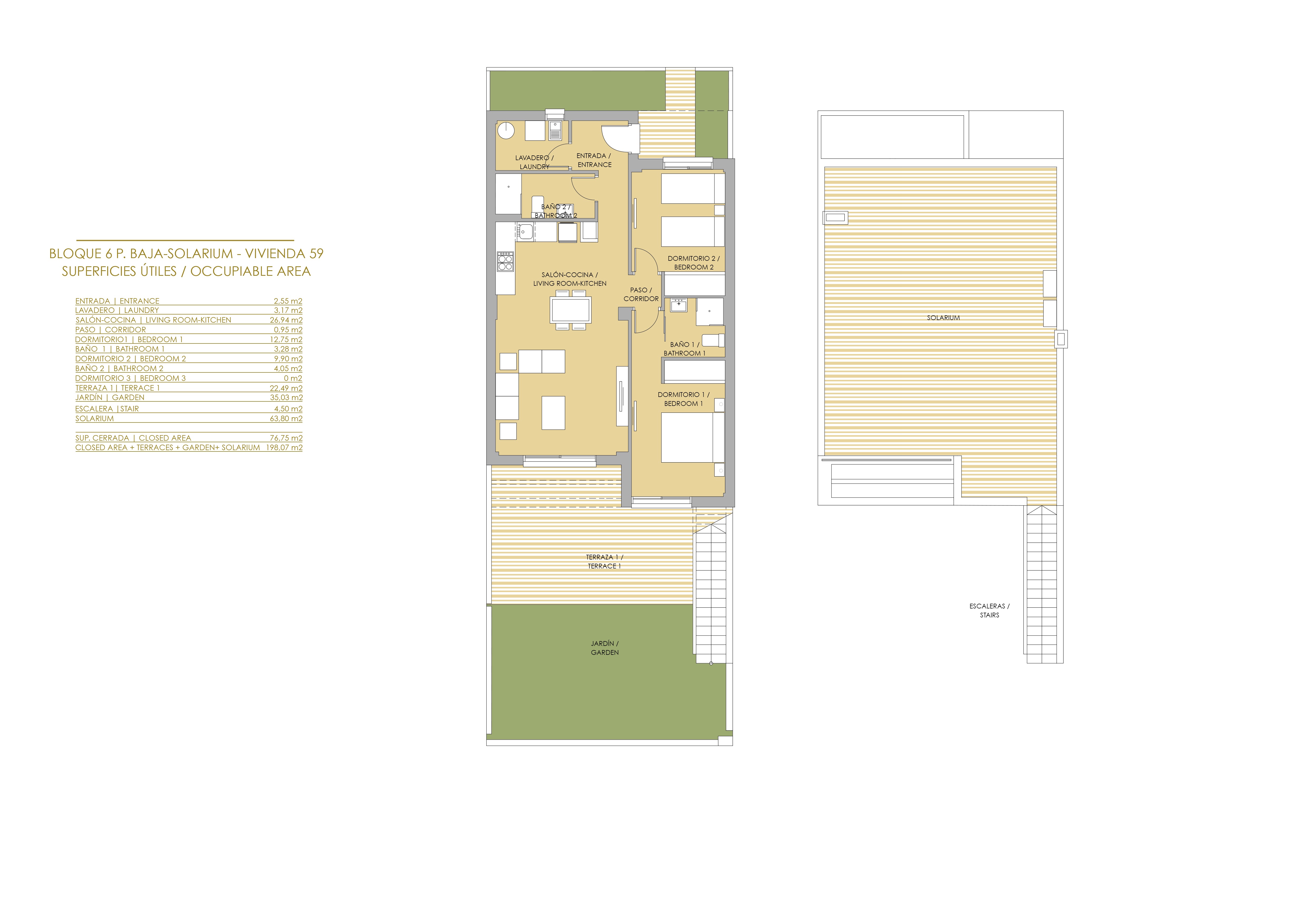 Boligernes interiør er omhyggeligt designet til at tilbyde komfort og funktionalitet. Lejlighederne, high-bungalows og low-bungalows fås i konfigurationer med 2 eller 3 soveværelser, alle med 2 badeværelser, hvilket sikrer komfort for familier af forskellig størrelse. Ejendommene har indbyggede skabe, der optimerer opbevaringspladsen og holder orden. Det keramiske gulv tilføjer et moderne touch og er let at vedligeholde, ideelt til den nuværende livsstil. Derudover er boligerne udstyret med aircondition og forinstallation til aircondition, hvilket sikrer et behageligt miljø året rundt.