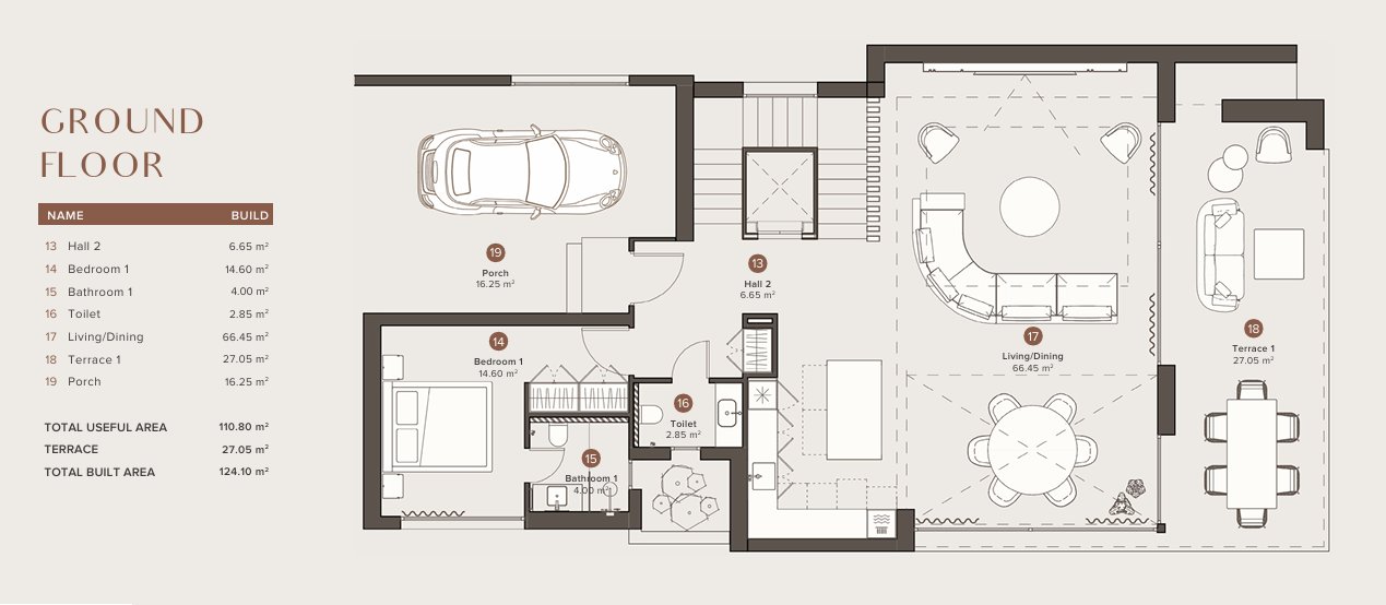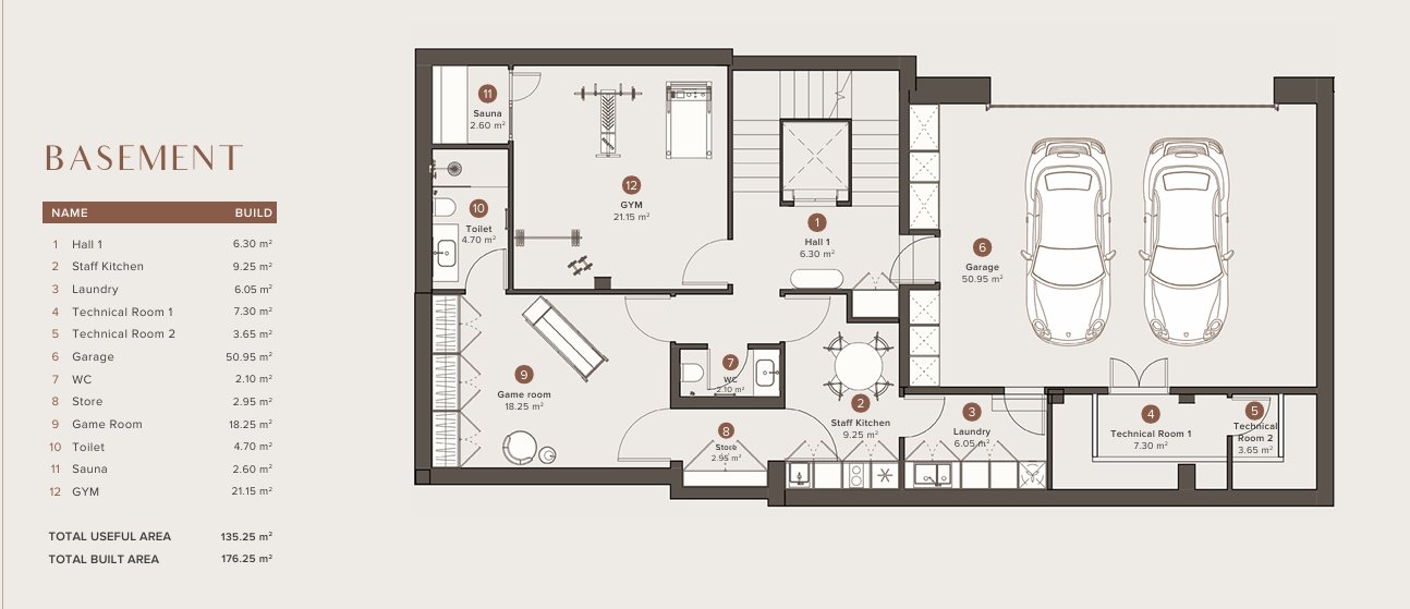 Indretningen af villaerne er omhyggeligt designet for at tilbyde maksimal komfort og stil. Med fire soveværelser og fire badeværelser garanterer hver ejendom en rummelig og funktionel plads til hele familien. Gulve af porcelænsfliser tilføjer et moderne og elegant touch til hvert rum. Villaerne har også indbyggede skabe, der giver effektiv opbevaring og holder designet rent og ryddeligt. Inkluderingen af en privat garage sikrer bekvemmelighed og sikkerhed for beboernes køretøjer.