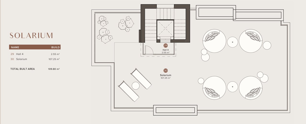 Villaerne har udendørsområder designet til at nyde middelhavsklimaet. Hver ejendom inkluderer en privat have, perfekt til at skabe en personlig oase af ro. Derudover tilbyder terrasserne et ideelt rum til udendørs underholdning eller blot til afslapning, mens man nyder havudsigten. Tilstedeværelsen af et solarium tilføjer et strejf af luksus, der giver beboerne mulighed for at udnytte solen maksimalt året rundt. For at fuldende oplevelsen har hver villa en privat pool, der giver et forfriskende sted at nyde på de varmeste dage.