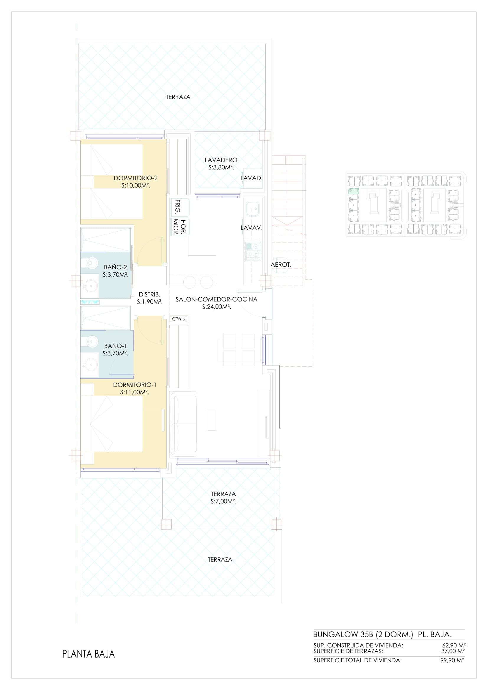 Located in the charming town of Torrevieja, this residential complex offers a selection of 42 properties including bungalows, high-bungalows, and low-bungalows. The location is ideal for those looking to enjoy life near the sea, as it is just 3.5 km from the coast. Additionally, the nearest airport is 21 km away, making access easy for frequent travelers. The homes are designed to offer comfort and functionality, with options of 2 and 3 bedrooms and 2 bathrooms, catering to different family needs.