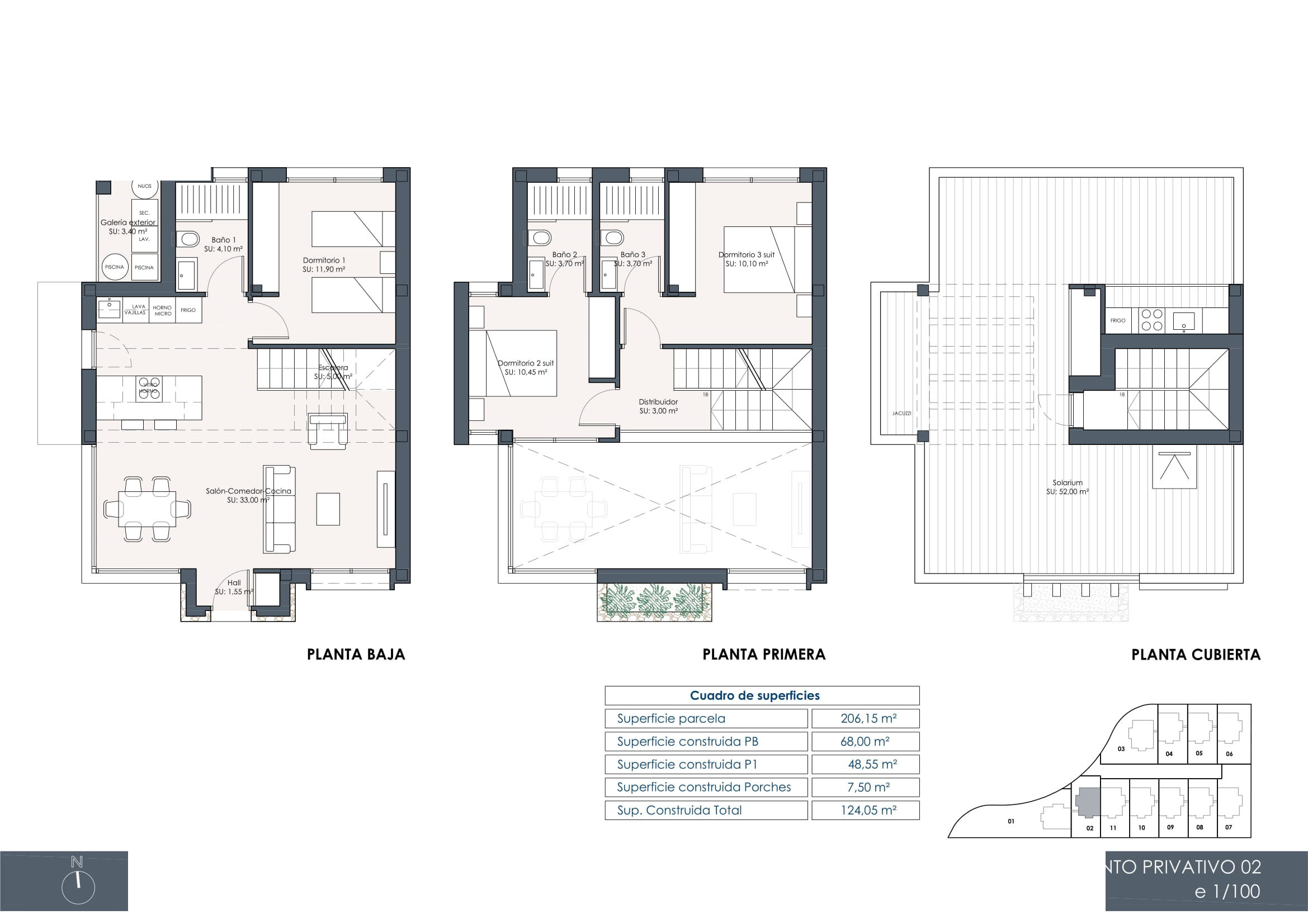 The exteriors of these detached homes in Los Montesinos are designed to enjoy the Mediterranean climate. Each property features a private pool, ideal for cooling off on hot days. Additionally, the terraces and solariums offer perfect spaces for outdoor relaxation or dining under the pergola. The exterior design is complemented by electric shutters, adding not only convenience but also a touch of modernity and security.