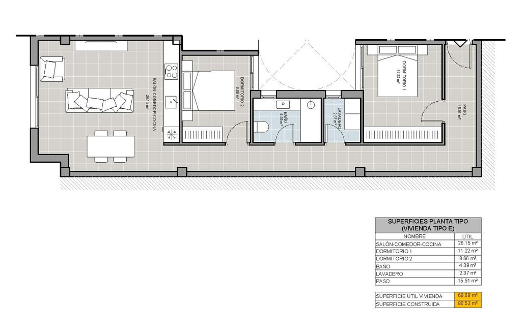 Located in the beautiful town of Torrevieja, this residential complex offers a selection of 21 homes including apartments and penthouses. The location is ideal for those looking to enjoy the coast, as it is just 600 meters from the sea. Additionally, it is conveniently situated 45 kilometers from the airport, facilitating access for residents and visitors. The homes are designed to offer comfort and functionality, with options of 1, 2, or 3 bedrooms and 1 or 2 bathrooms, adapting to different family needs.