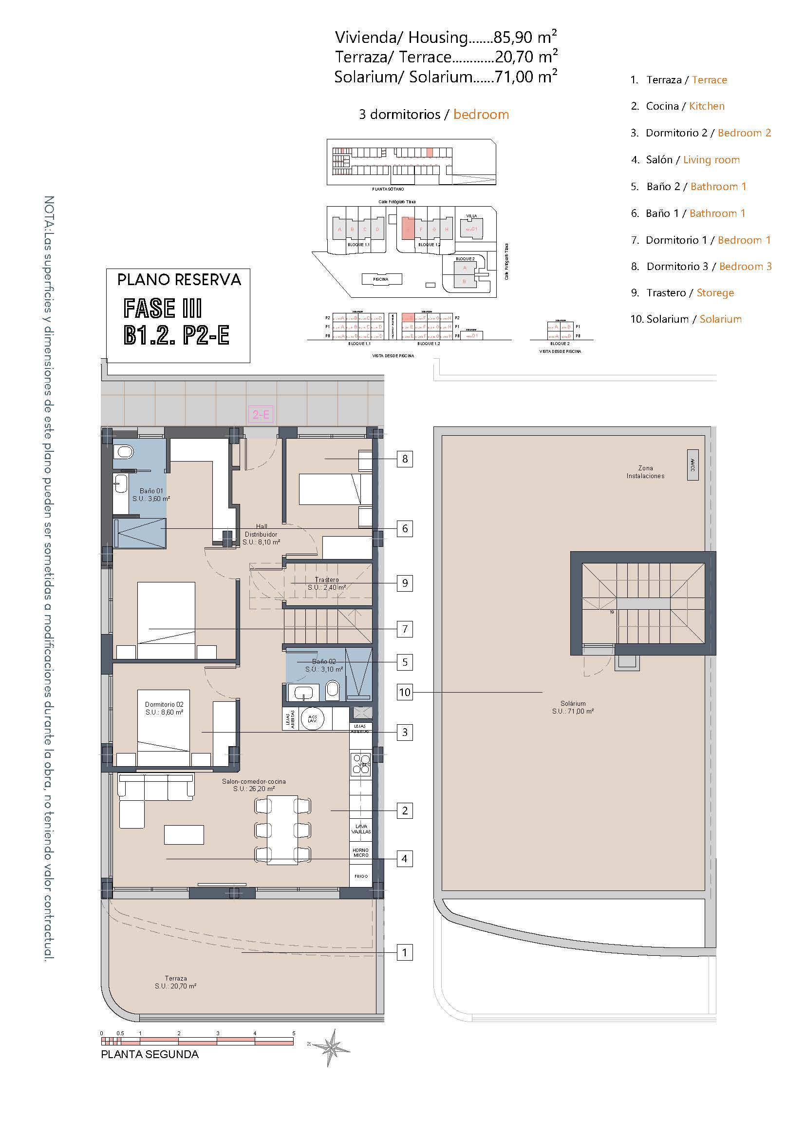The exteriors of this residential complex are designed to complement the natural surroundings of Los Alcázares. The homes feature private terraces, perfect for enjoying the Mediterranean climate and surrounding views. Additionally, some properties offer the option of a solarium, providing extra outdoor space for relaxation or socializing. The communal gardens are carefully maintained, offering a green space where residents can enjoy the tranquility and beauty of the landscape. The proximity to the sea, just 1 km away, allows for coastal walks and water activities.