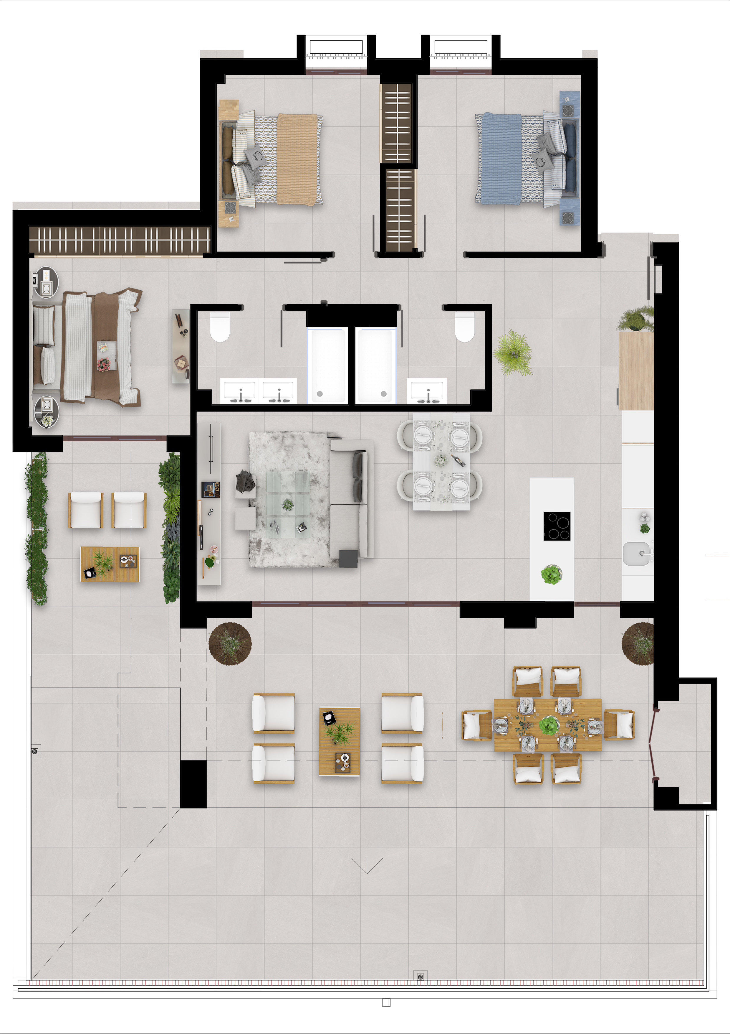 The interiors of the homes are designed with a focus on functionality and rustic aesthetics, but with a contemporary twist that maximises the feeling of spaciousness and light. The 2 and 3-bedroom flats and penthouses feature open-plan spaces that facilitate the circulation of natural light and allow you to enjoy the views of the outdoors from any point in the property. Terraces and solariums offer additional space for relaxing or entertaining outdoors, in an environment that combines the best of modern comfort with rustic charm.