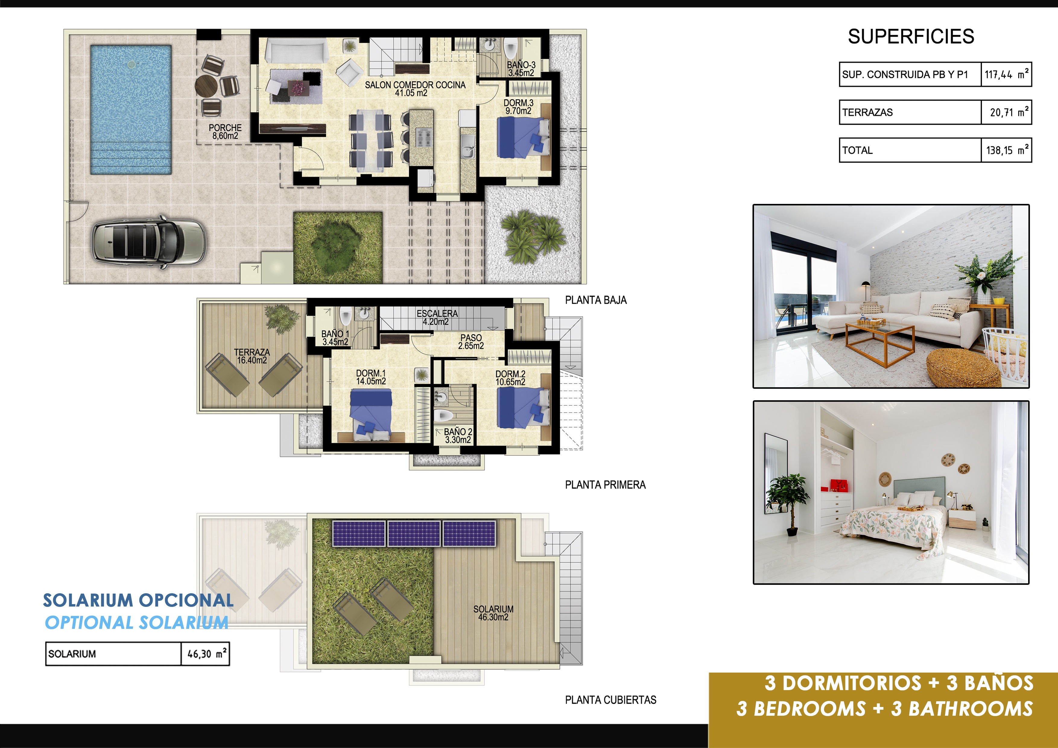 The outdoors of these detached homes in Orihuela are designed to maximize enjoyment of the surroundings. Each property features a private garden, ideal for creating a personal oasis of tranquility. The terraces offer additional space for relaxation or entertaining guests, while the option of a solarium allows for panoramic views and sun enjoyment all year round. Additionally, each home has a private pool, perfect for cooling off on hot days. The inclusion of a pergola adds a touch of elegance and functionality, providing shade and style to outdoor spaces.