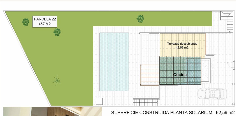 El exterior es un verdadero refugio de serenidad. El jardín privado invita a disfrutar del cálido clima mediterráneo, mientras que la piscina privada ofrece un lujo refrescante para relajarse en cualquier momento. La terraza es el lugar perfecto para cenas al aire libre, y el solárium proporciona un espacio exclusivo para disfrutar de las vistas panorámicas y el sol.
