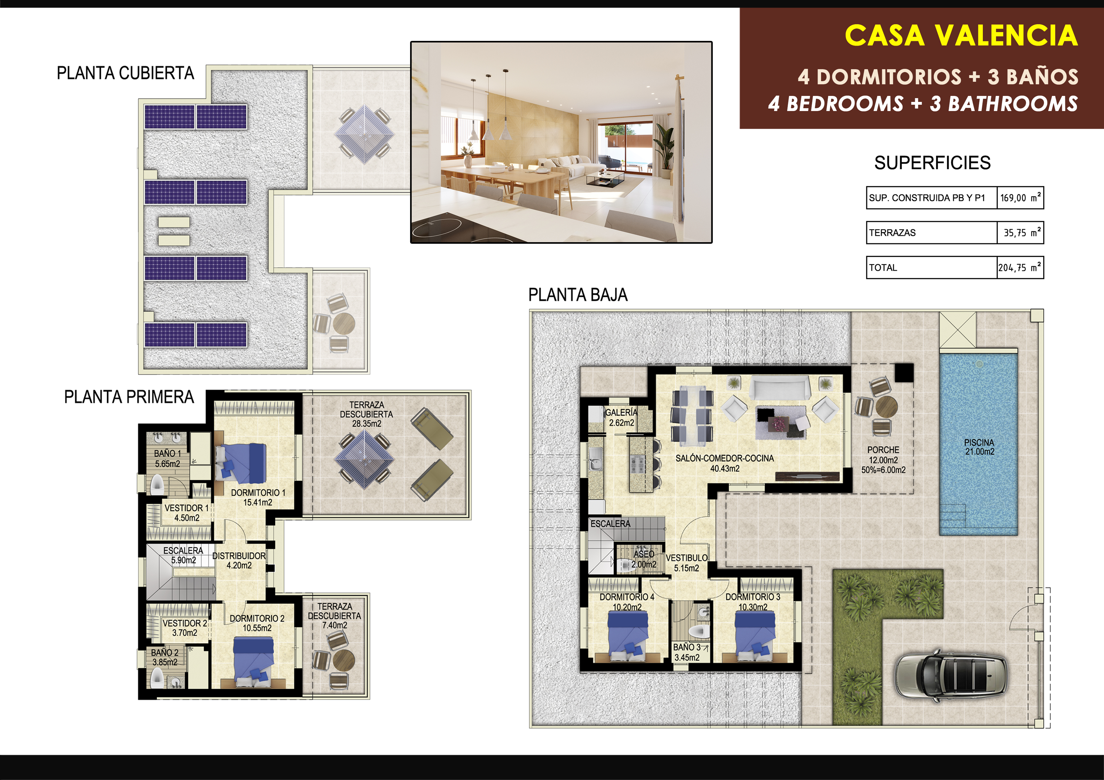 En el interior, las villas están equipadas con suelos de gres porcelánico, que ofrecen durabilidad y un acabado elegante. Las propiedades cuentan con tres dormitorios y tres baños, proporcionando un espacio amplio y cómodo para toda la familia. Las persianas eléctricas y los electrodomésticos incluidos añaden un toque de modernidad y conveniencia. Además, los armarios empotrados y la preinstalación de aire acondicionado aseguran un confort óptimo durante todo el año.