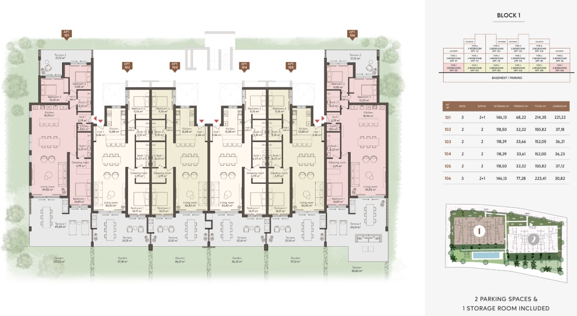 L'intérieur des logements est conçu pour offrir un maximum de confort et de fonctionnalité. Les options de distribution incluent des propriétés de 2, 3 et 4 chambres, chacune avec 2, 3 ou 4 salles de bains, s'adaptant à différents styles de vie et besoins familiaux. Les cuisines sont équipées d'appareils modernes, et le système de climatisation assure une ambiance agréable tout au long de l'année. Les placards intégrés offrent un vaste espace de rangement, tandis que le chauffage par le sol ajoute une touche de luxe et de confort. Chaque détail a été soigneusement pensé pour créer un foyer accueillant et efficace.