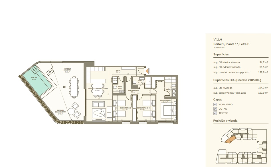 L'intérieur de ces résidences est conçu pour offrir un confort et une fonctionnalité maximaux. Les sols en grès cérame apportent une touche moderne et élégante, tandis que le système de climatisation garantit une température agréable toute l'année. Les cuisines sont équipées d'appareils de haute qualité, et les placards intégrés offrent un vaste espace de rangement. La sécurité et le confort sont renforcés par l'installation d'un vidéophone dans chaque unité.