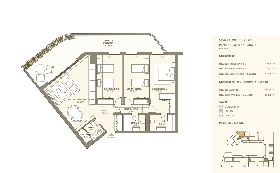 L'intérieur de ces résidences est conçu pour offrir un confort et une fonctionnalité maximaux. Les sols en grès cérame apportent une touche moderne et élégante, tandis que le système de climatisation garantit une température agréable toute l'année. Les cuisines sont équipées d'appareils de haute qualité, et les placards intégrés offrent un vaste espace de rangement. La sécurité et le confort sont renforcés par l'installation d'un vidéophone dans chaque unité.