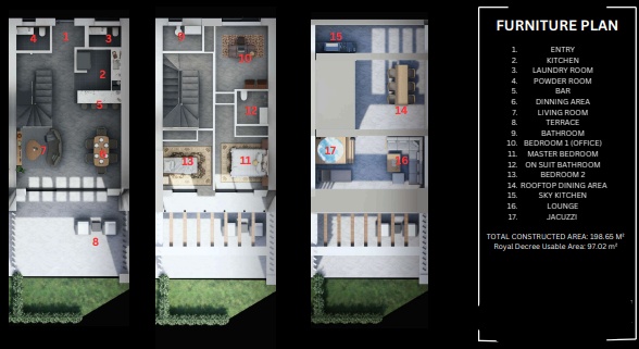 Rekkehusene har utendørsområder designet for å maksimere nytelsen av middelhavsklimaet. Hver eiendom har en privat hage, ideell for avslapning eller for å nyte med familien. Terrassene tilbyr et ekstra utendørsområde, perfekt for middager i solnedgangen eller bare for å nyte utsikten. Tilstedeværelsen av et privat boblebad i hver bolig tilfører et snev av luksus og velvære, slik at beboerne kan nyte avslappende øyeblikk i hjemmets intimitet.