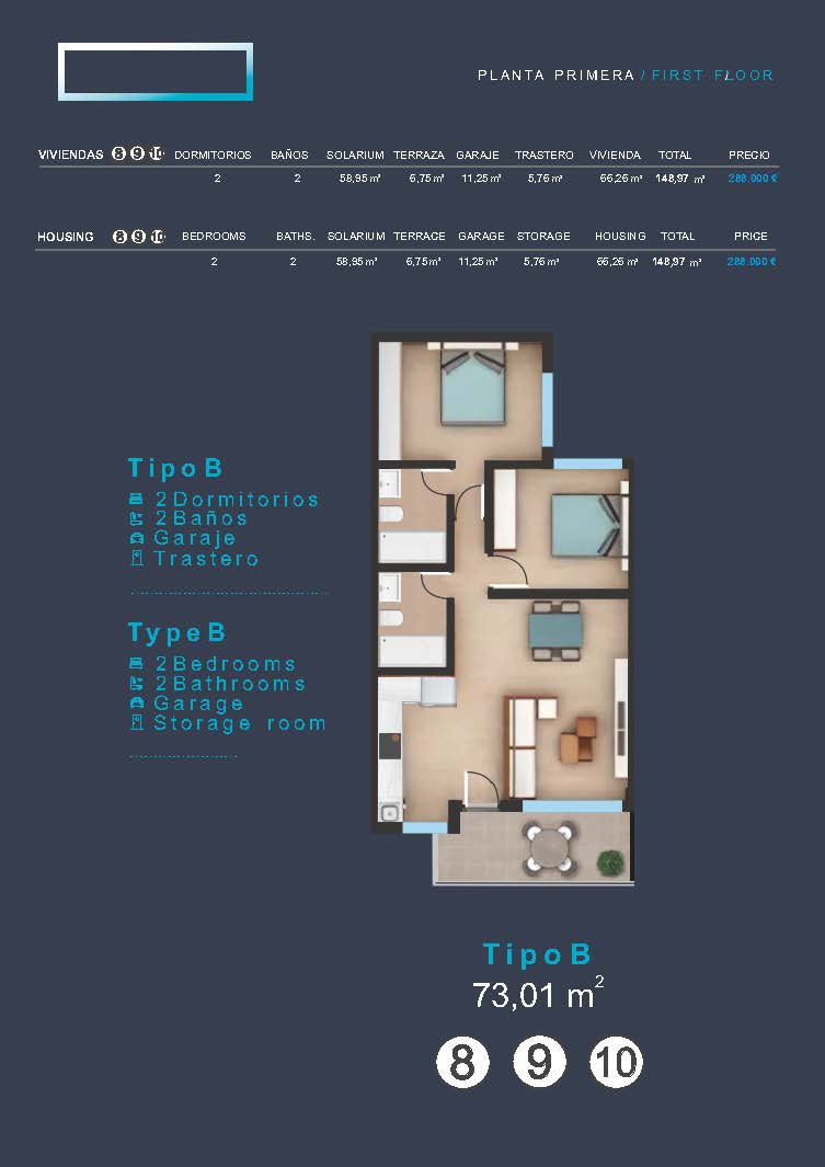 Interiøret i disse boligene er designet med fokus på kvalitet og komfort. Gulv i porselensfliser gir hvert rom et moderne og elegant preg. Planløsningen inkluderer 2 bad, som sikrer komfort for alle familiemedlemmer. Boligene er utstyrt med innebygde garderober, som optimaliserer lagringsplassen. Forhåndsinstallasjon av klimaanlegg sikrer et behagelig miljø året rundt. I tillegg gir videointercom ekstra sikkerhet og komfort. Inkluderingen av en privat garasje gir et ekstra nivå av bekvemmelighet for beboerne.