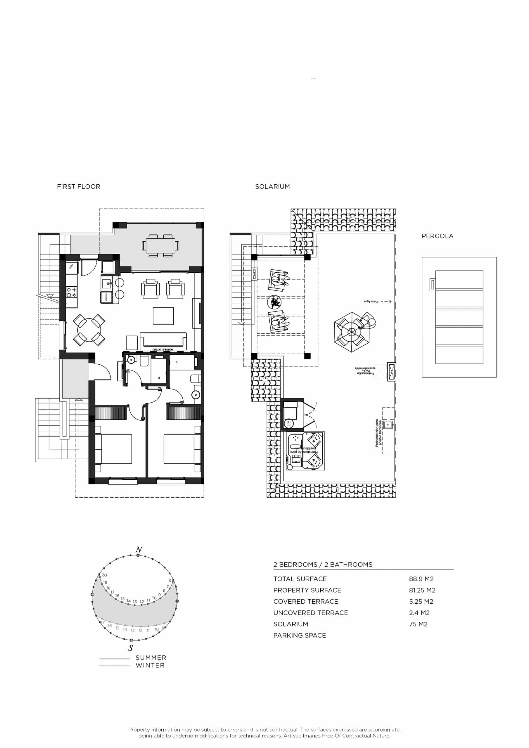 Wnętrza bungalowów zaprojektowano z dbałością o szczegóły, wprowadzając nowoczesne i praktyczne rozwiązania. Podłogi z gresu porcelanowego zapewniają eleganckie i trwałe wykończenie, a elektryczne rolety i zintegrowane urządzenia ułatwiają codzienne życie. Wbudowane szafy oferują efektywne przechowywanie, a jacuzzi dodaje odrobinę luksusu i relaksu. Układ obejmuje dwie sypialnie i dwie łazienki, a każda przestrzeń jest zoptymalizowana pod kątem komfortu i prywatności.