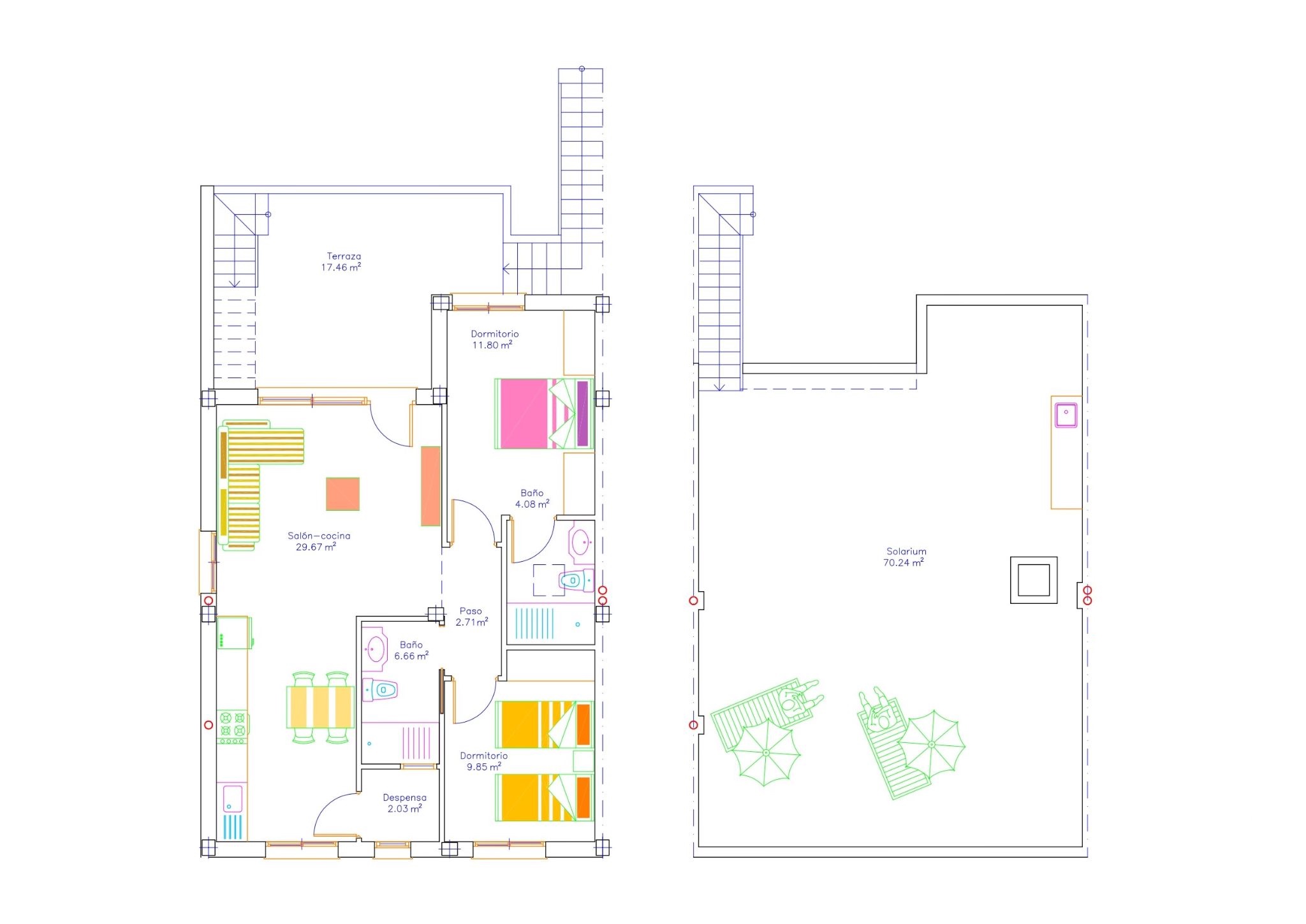 De buitenruimtes van deze bungalows in San Javier zijn ontworpen om het mediterrane klimaat het hele jaar door te genieten. Elke woning heeft een privétuin, perfect om een persoonlijke oase van rust te creëren of om buitenmomenten met vrienden en familie te genieten. Bovendien bieden de terrassen extra ruimte om te ontspannen, zonnebaden of buiten te dineren. De aanwezigheid van een solarium in elke bungalow biedt een ideale plek om te genieten van het uitzicht en het zonnige weer, en wordt een veelzijdige ruimte voor diverse buitenactiviteiten.