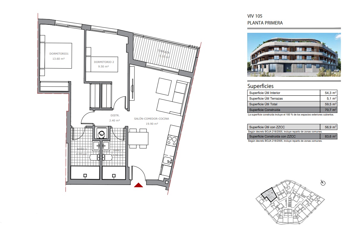 De woningen zijn ontworpen met een focus op functionaliteit en comfort. De appartementen, begane grond en penthouses bieden opties met 1 of 2 slaapkamers en 1 of 2 badkamers, die zich aanpassen aan verschillende gezinsbehoeften. Het interieur van de woningen is uitgerust met keramische vloeren, elektrische rolluiken en apparaten, wat zorgt voor een moderne en praktische omgeving. Ingebouwde kasten bieden efficiënte opslagruimte, terwijl de video-intercom een extra niveau van veiligheid en gemak toevoegt. De indeling omvat een garage, wat parkeren en directe toegang tot de woningen vergemakkelijkt.