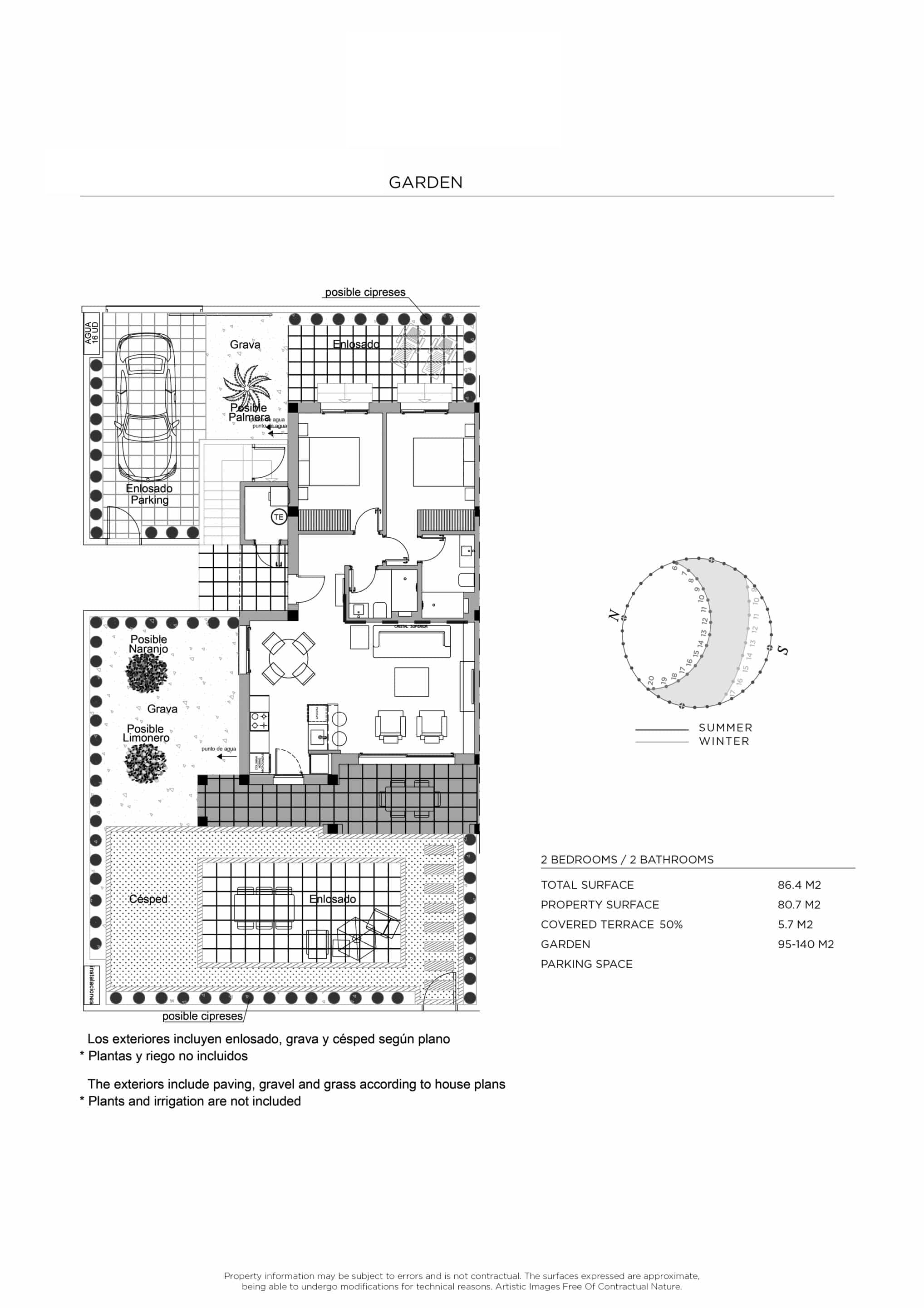 Het interieur van de bungalows is zorgvuldig ontworpen om comfort en stijl te bieden. Met twee slaapkamers en twee badkamers is elke ruimte geoptimaliseerd voor comfort. De vloeren van porseleinen tegels geven een moderne uitstraling en zijn gemakkelijk te onderhouden. Elektrische rolluiken en ingebouwde kasten zijn standaardkenmerken die de functionaliteit van het huis verbeteren. Bovendien zorgt de voorinstallatie van airconditioning ervoor dat het binnenklimaat altijd aangenaam is. De indeling omvat een garage, die een veilige plek voor het voertuig biedt.