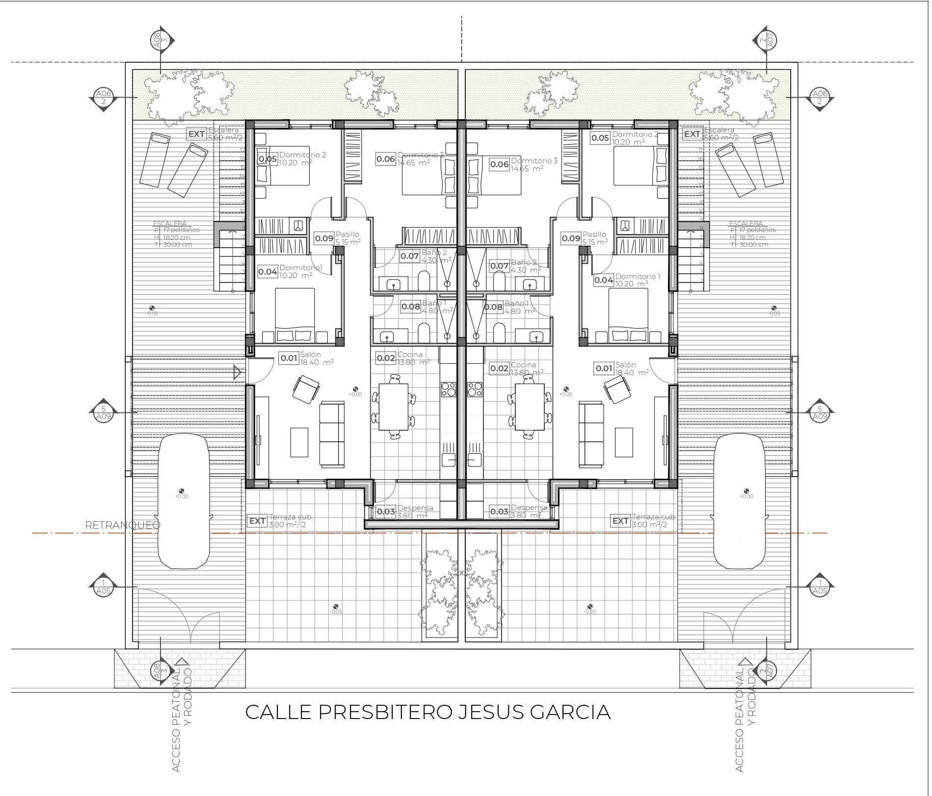 Radhusen har utomhusområden som inbjuder till avkoppling och njutning av medelhavsklimatet. Varje bostad har en privat terrass, perfekt för att njuta av måltider utomhus eller bara koppla av i solen. Dessutom erbjuder solariumet ett extra utrymme för att sola med total integritet. Närheten till havet, bara 1 km bort, gör det möjligt att njuta av kustpromenader och vattensporter, vilket gör området idealiskt för havsälskare.