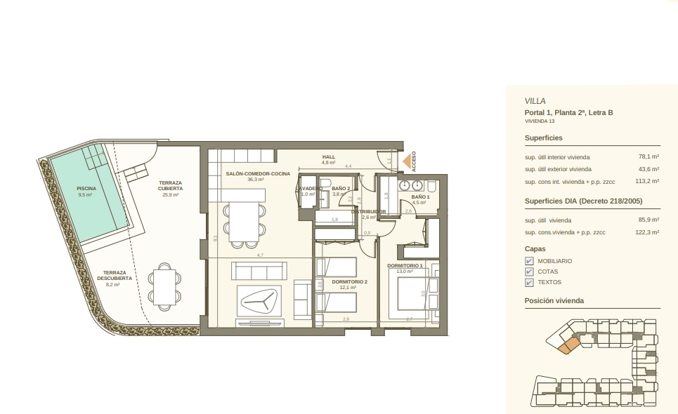 Interiören i dessa bostäder är utformad för att erbjuda maximal komfort och funktionalitet. Golv i porslinsplattor ger en modern och elegant touch, medan luftkonditioneringssystemet garanterar en behaglig temperatur året runt. Köken är utrustade med högkvalitativa vitvaror, och inbyggda garderober erbjuder gott om förvaringsutrymme. Säkerhet och komfort förstärks med installation av videoporttelefon i varje enhet.