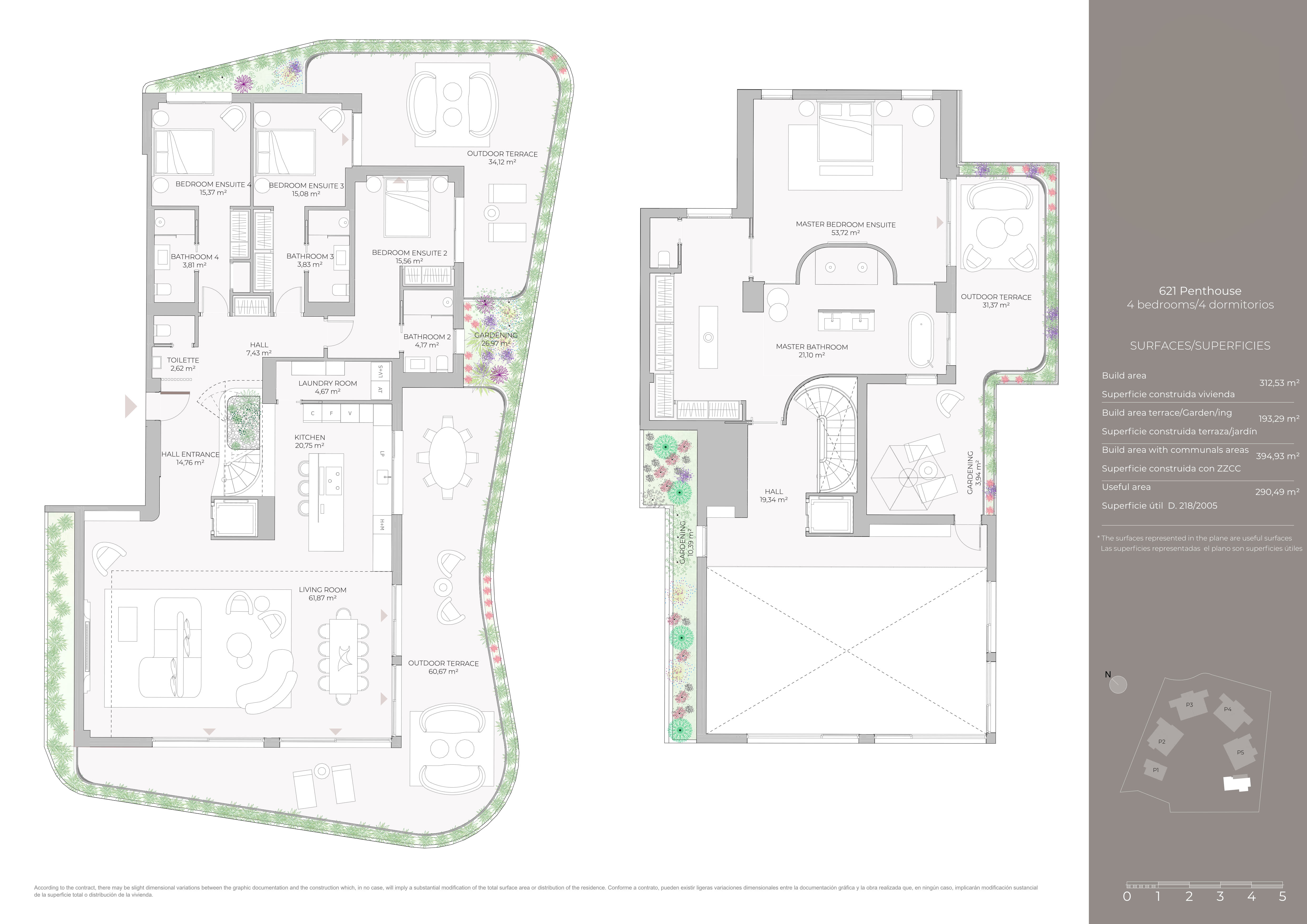 Interiören i varje bostad är designad med fokus på kvalitet och komfort. Golv i porslinskeramik ger en touch av elegans och hållbarhet, medan golvvärme säkerställer en mysig atmosfär året runt. Bostäderna är utrustade med moderna vitvaror och har ett hemautomationssystem som möjliggör effektiv kontroll av olika aspekter av hemmet. Elektriska persienner och inbyggda garderober bidrar till funktionalitet och daglig komfort. Planlösningsalternativen inkluderar bostäder med 3 och 4 sovrum, med 3 eller 4 badrum, anpassade för olika familjebehov.