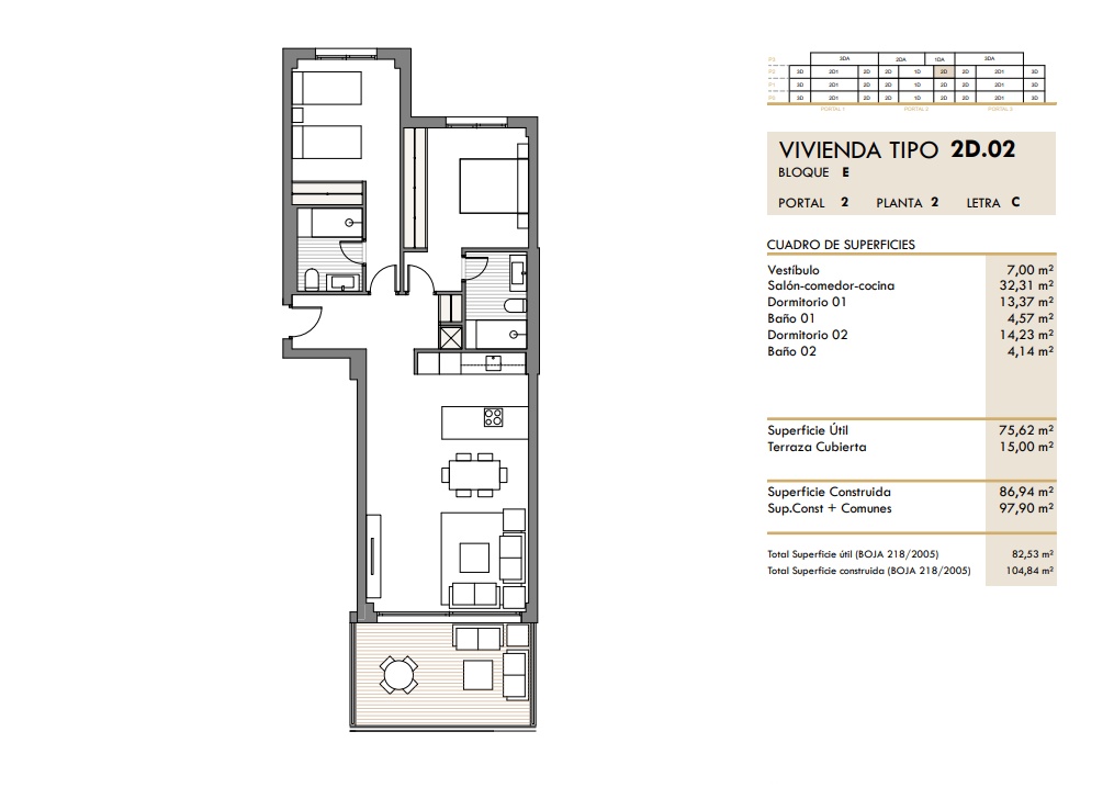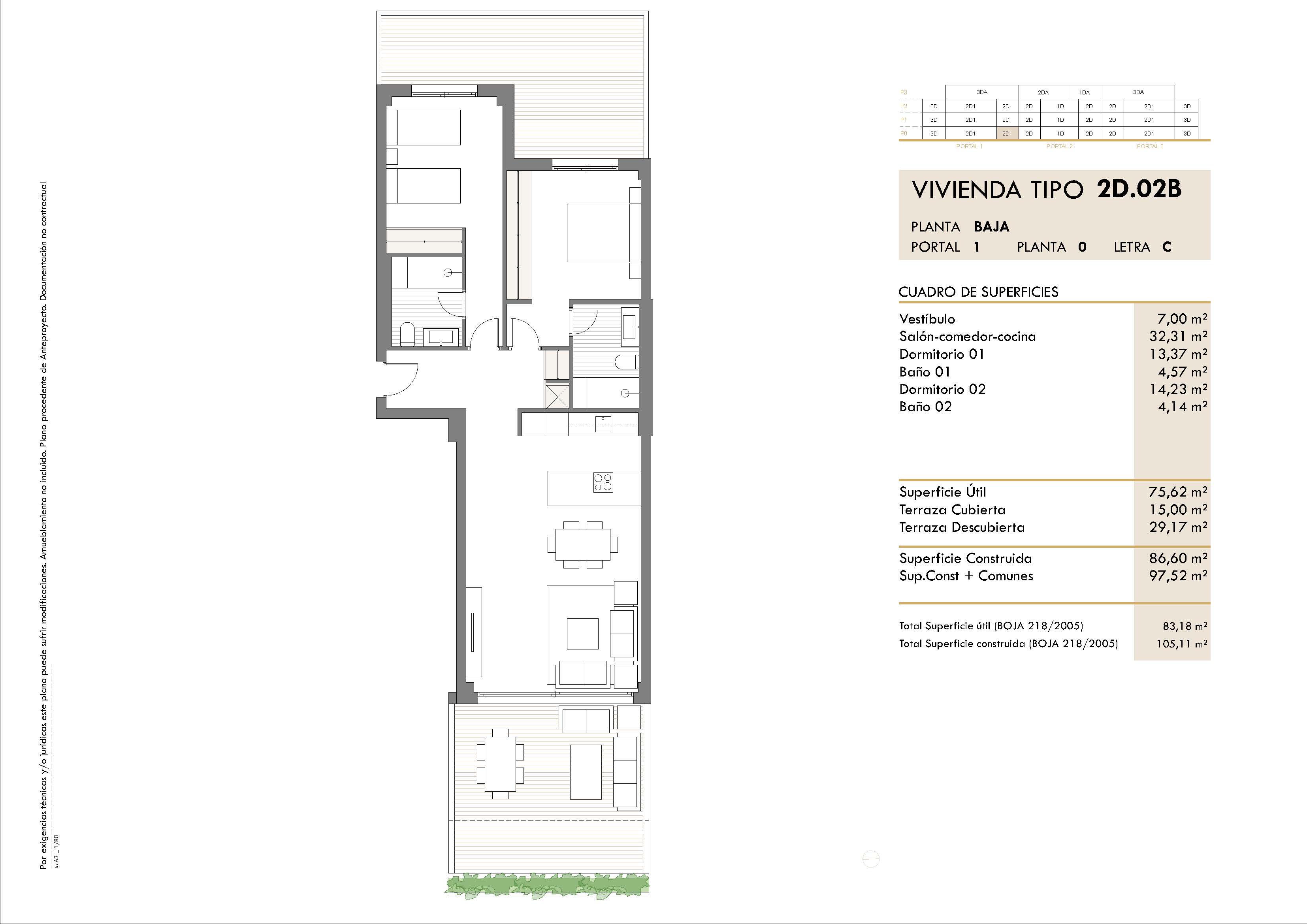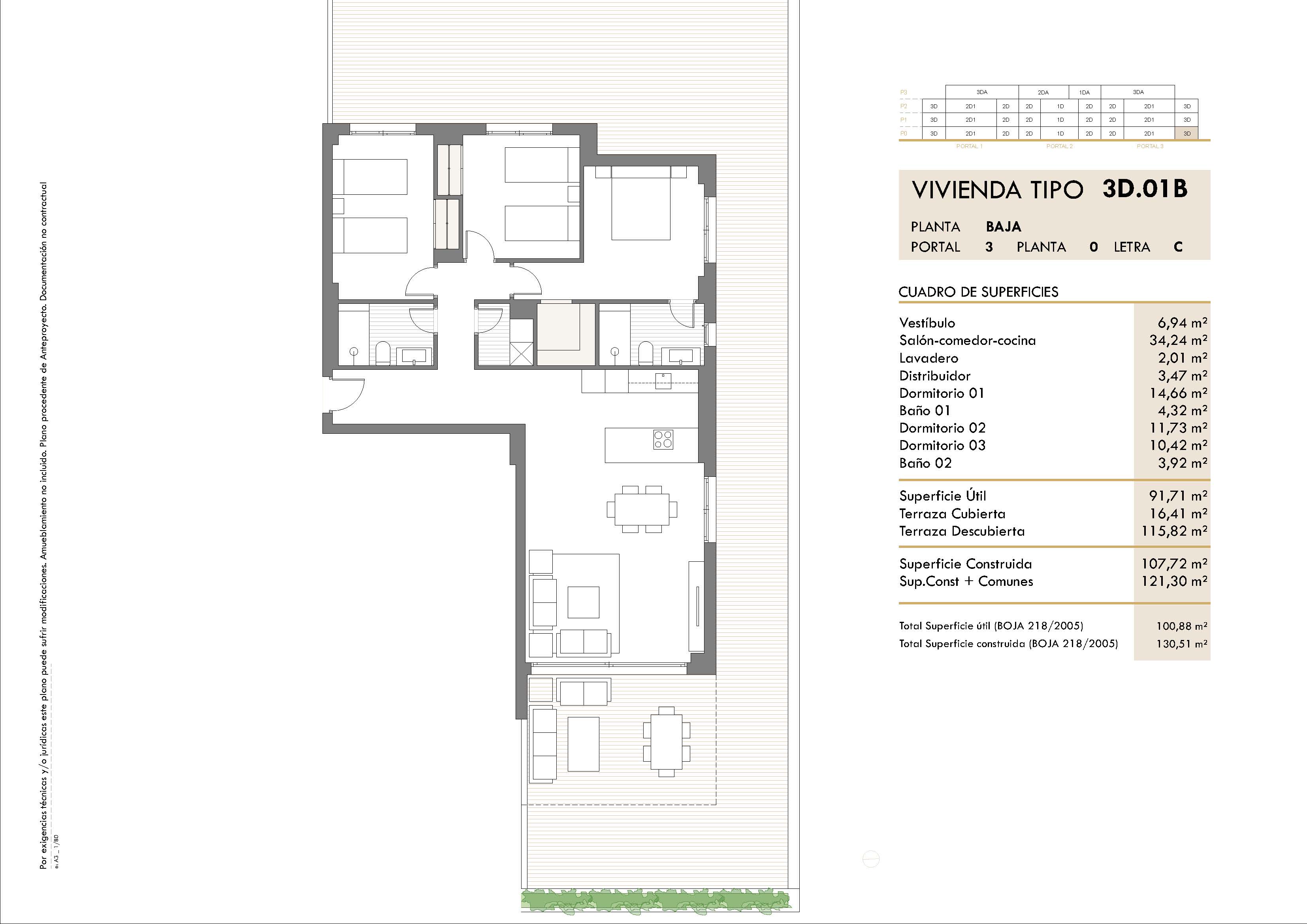 En el interior, las viviendas están equipadas con características modernas y funcionales. Los suelos de gres porcelánico aportan un toque de elegancia y durabilidad a los espacios. Las propiedades están equipadas con electrodomésticos de alta calidad, lo que garantiza comodidad y eficiencia en el día a día. Los armarios empotrados ofrecen soluciones de almacenamiento prácticas y estéticas. Además, el sistema de videoportero proporciona un nivel adicional de seguridad y tranquilidad para los residentes. La distribución de las viviendas varía, con opciones de 1, 2 y 3 dormitorios, y 1 o 2 baños, adaptándose a diferentes necesidades y estilos de vida. Todas las viviendas incluyen garaje, asegurando comodidad y seguridad para los vehículos de los residentes.