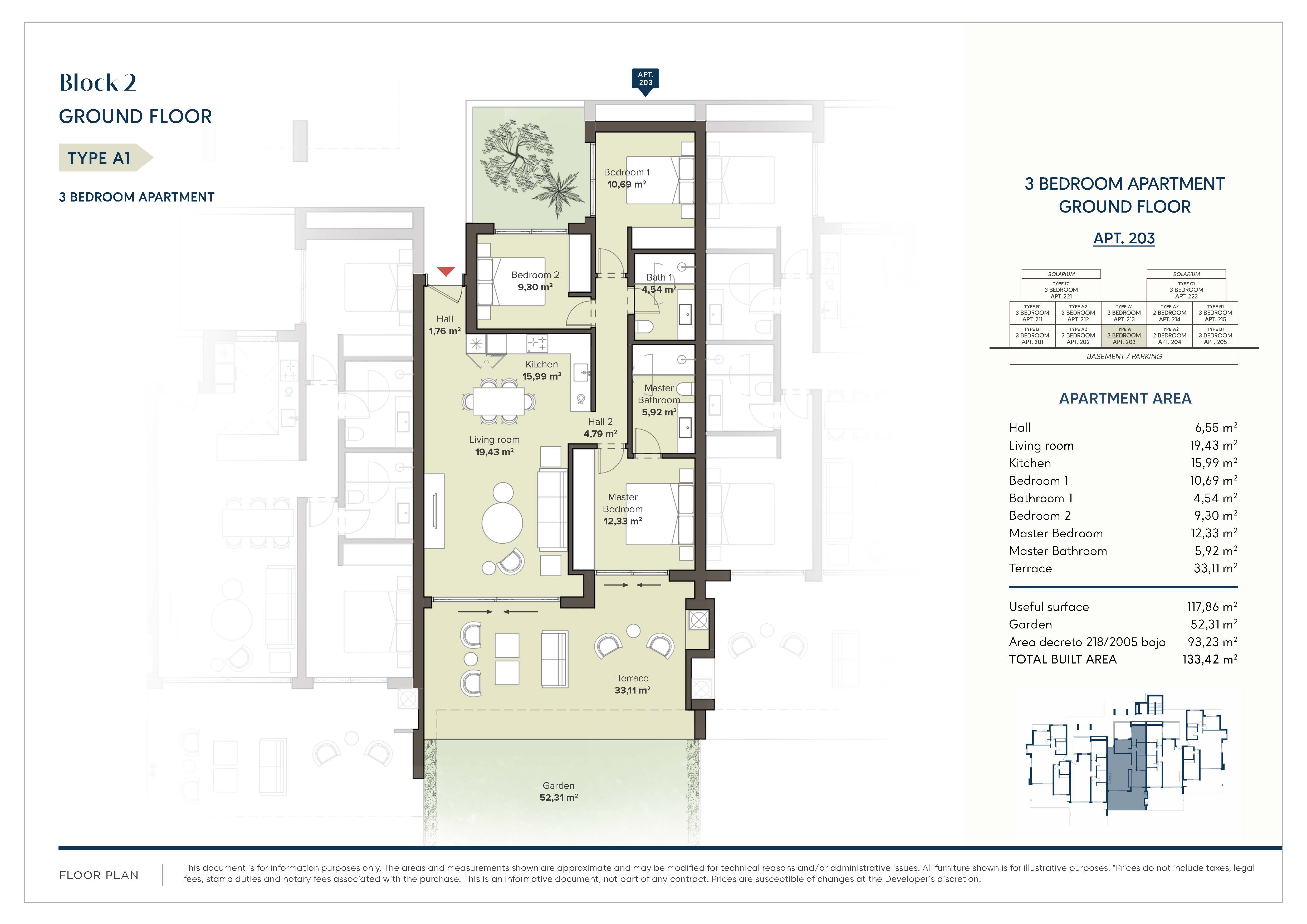 Интерьер этих домов разработан с акцентом на комфорт и современность. Квартиры и первые этажи предлагают варианты с 2 или 3 спальнями и 2 ванными комнатами, адаптированные к различным семейным потребностям. Подогрев пола обеспечивает теплую и уютную атмосферу в более холодные месяцы. Керамическая плитка придает элегантность и легкость в уходе. Современные бытовые приборы и продвинутая система умного дома облегчают повседневную жизнь, а встроенные шкафы обеспечивают эффективное хранение.